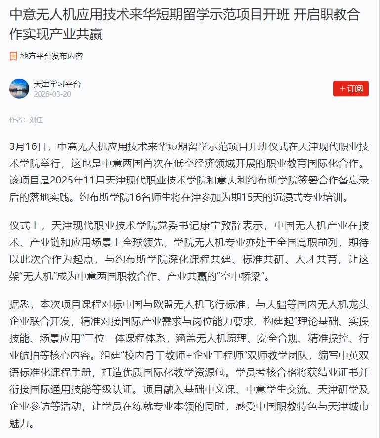 3月16日,中意无人机应用技术来华短期留学示范项目开班仪式在天津现代职业技术…