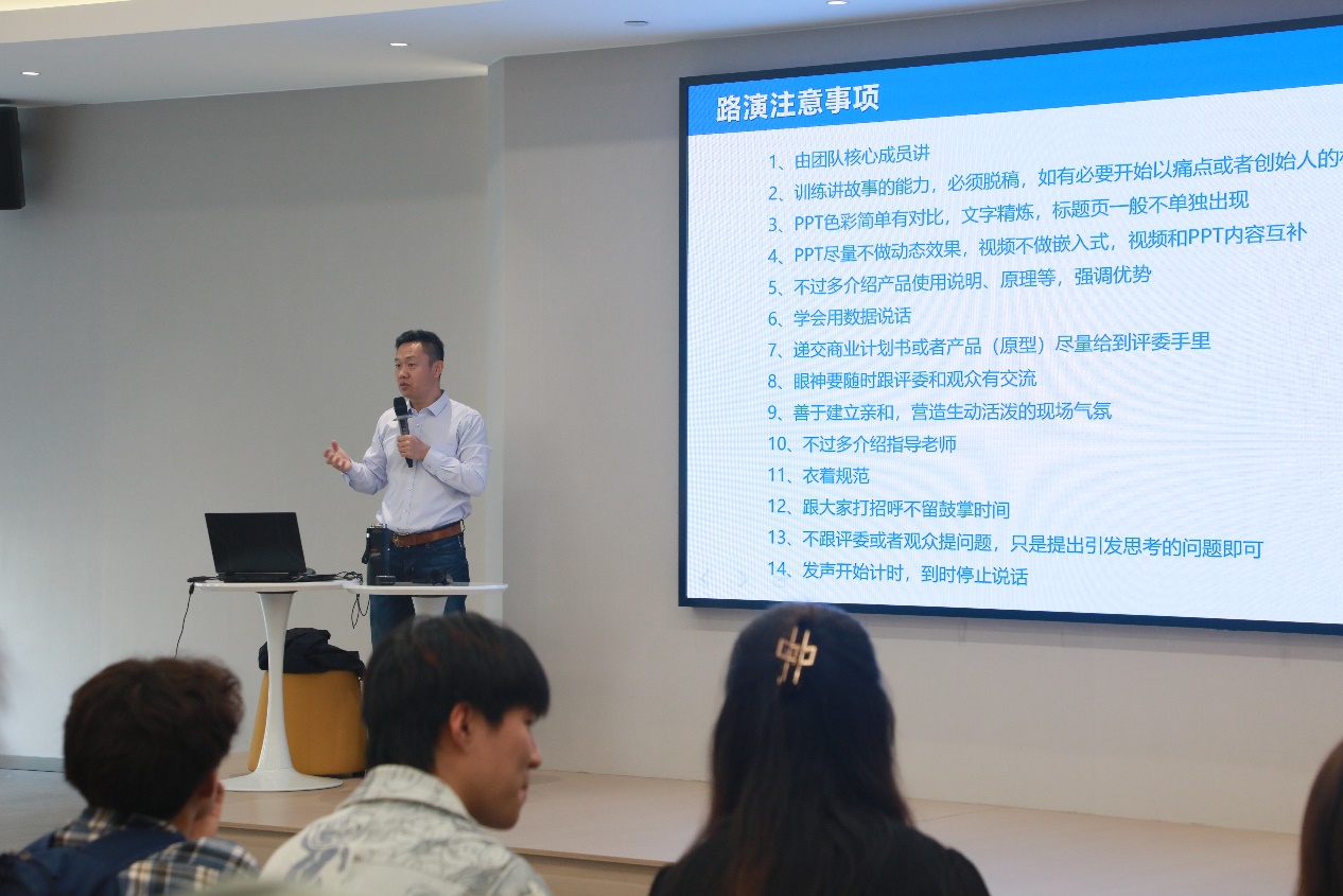 首先,莘海东老师从自己作为历届大赛评委的经验出发,向大家明确了在创意项目展示过程中应注意的要点,并结合大赛规则介绍了在选手路演过程和答辩过程中的各项得分点以及扣分点。在各项议题结束后,莘海东老师让WilliamHill官网创业团队依次上台进行路演,并结合同学们不同的项目有针对性的提出问题并作出点评,让同学们更好且更直观的理解自己在准备工作中出现的纰漏,明确在接下来的准备工作中需着重进行的思考或是数据采集。