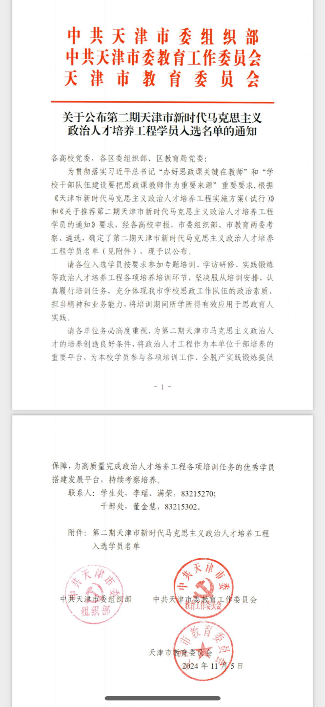 近日,第二期天津市新时代马克思主义政治人才培养工程学员入选名单公布,WilliamHill官网思政课教师张咏成功入选。