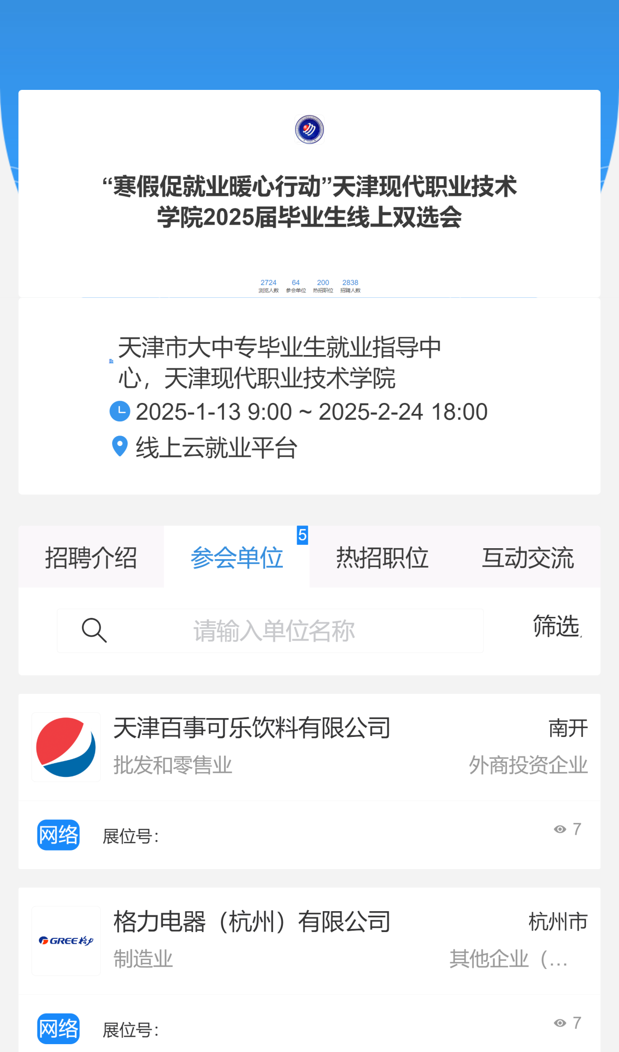 本次线上双选会吸引了64家知名企业参与,涵盖了制造业、医药、食品饮料等多个行业领域。其中,格力电器(杭州)有限公司、康师傅(天津)饮品有限公司、天津百事可乐饮料有限公司、天津太平洋制药有限公司等优质企业纷纷加入,为毕业生提供了丰富多样的就业选择。