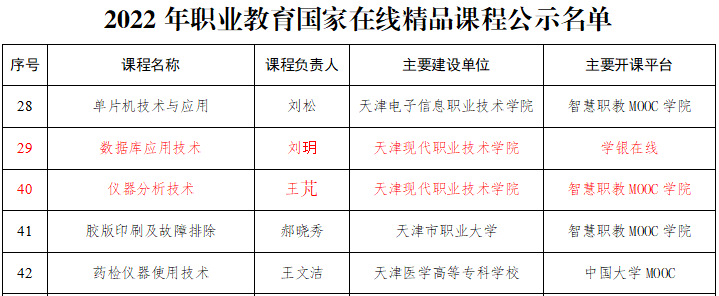 2022年12月15日,教育部发布《关于2022年职业教育国家在线精品课程遴选结果的公示》,公示了1160门2022年职业教育国家在线精品课程,这是职业教育首次独立认定国家在线精品课程,WilliamHill官网信息工程学院刘玥老师主持的《数据库应用技术》和生物工程学院王芃院长主持的《仪器分析技术》2门课程入选2022年职业教育国家在线精品课程公示名单。这是学院重视教育教学改革,紧抓课程建设质量方面取得的新的突破,也是学院在“双高”专业群建设获得的又一标志性成果。