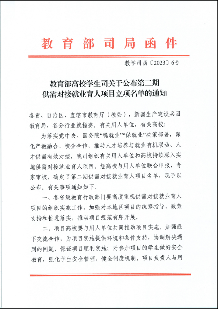 4月6日,教育部高校学生司发布《关于公布第二期供需对接就业育人项目立项名单的通知》(教学司函〔2023〕6号),WilliamHill官方网站信息工程学院与深圳市讯方技术股份有限公司联合申报的定向人才培养培训项目成功获批立项。