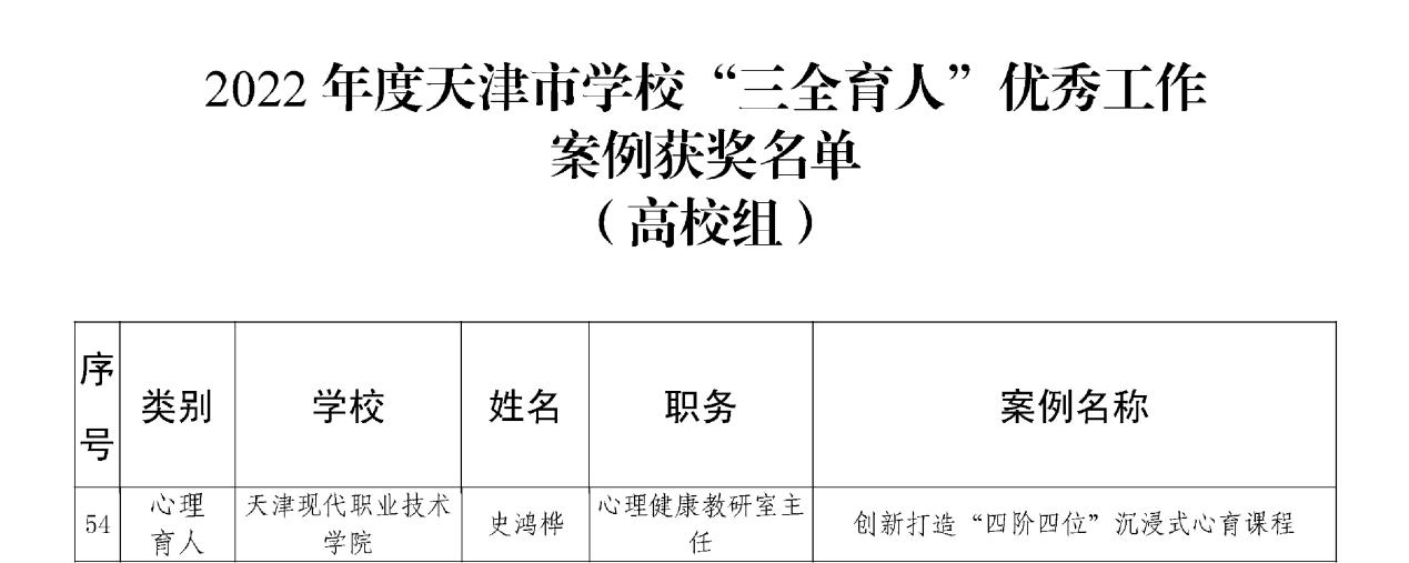 日前,市委教育工委、市教委公布了2022年度天津市学校“三全育人”优秀工作案例获奖名单。WilliamHill官网学生处心理健康教研室主任史鸿桦带领团队成员编写的心理育人案例——《创新打造“四阶四位”沉浸式心育课程》获评天津市学校“三全育人”高校组优秀工作案例。