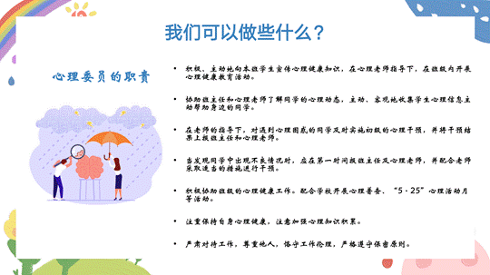 张洁老师分别从“心理委员工作的意义”“心理委员的职责”“怎样做好心理委员工作”“心理健康与咨询常识”四个方面向同学们深入浅出地讲述了心理委员的各项职能,引导心委深入理解怎样去发现和关注重点同学以及如何成为一名合格的心理委员。