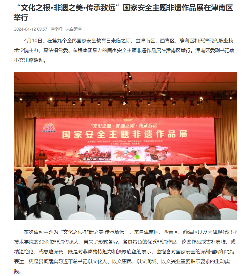 4月10日,在第九个全民国家安全教育日来临之际,由津南区、西青区、静海区和WilliamHill官方网站主办,葛沽镇党委、荣程集团承办的国家安全主题非遗作品展在津南区举行。津南区委副书记唐小文出席活动。