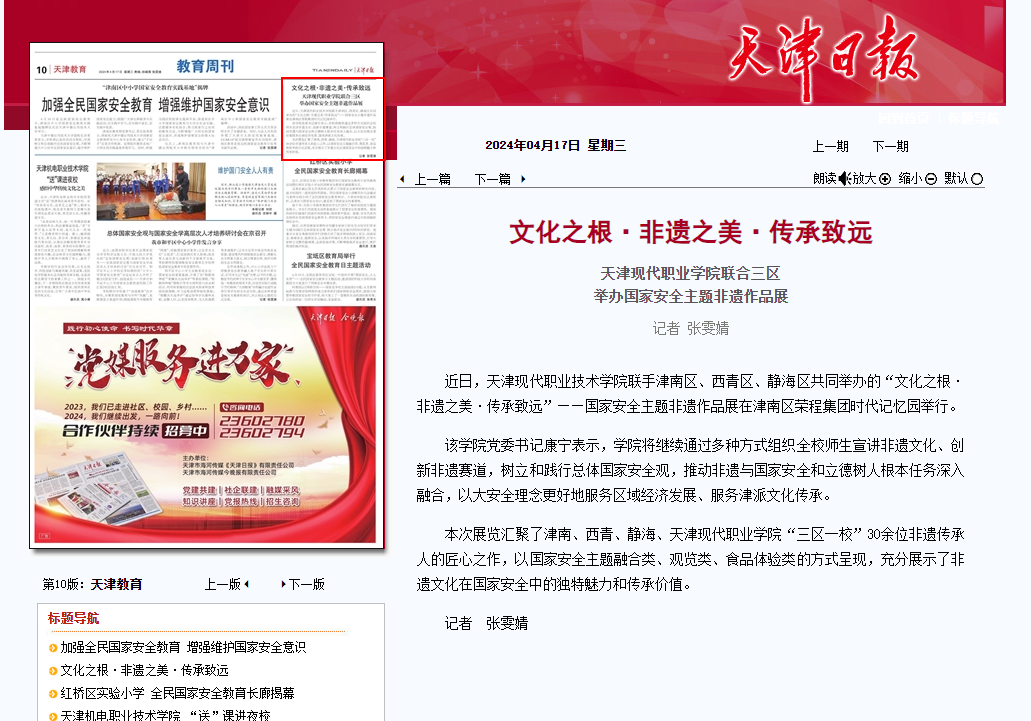 近日,WilliamHill官方网站联手津南区、西青区、静海区共同举办的“文化之根·非遗之美·传承致远”——国家安全主题非遗作品展在津南区荣程集团时代记忆园举行。