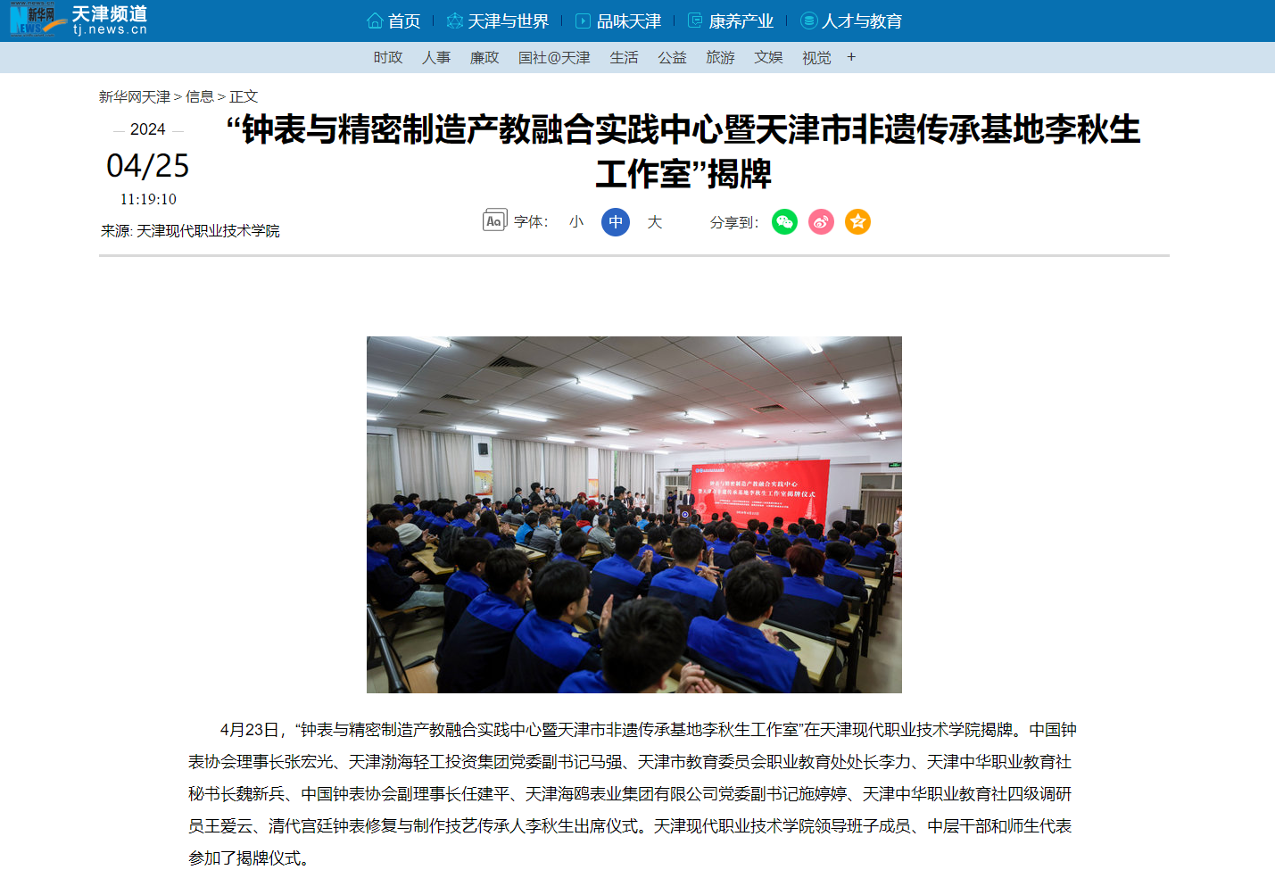 在热烈的掌声中,与会领导共同为“钟表与精密制造产教融合实践中心暨天津市非遗传承基地李秋生工作室”揭牌。