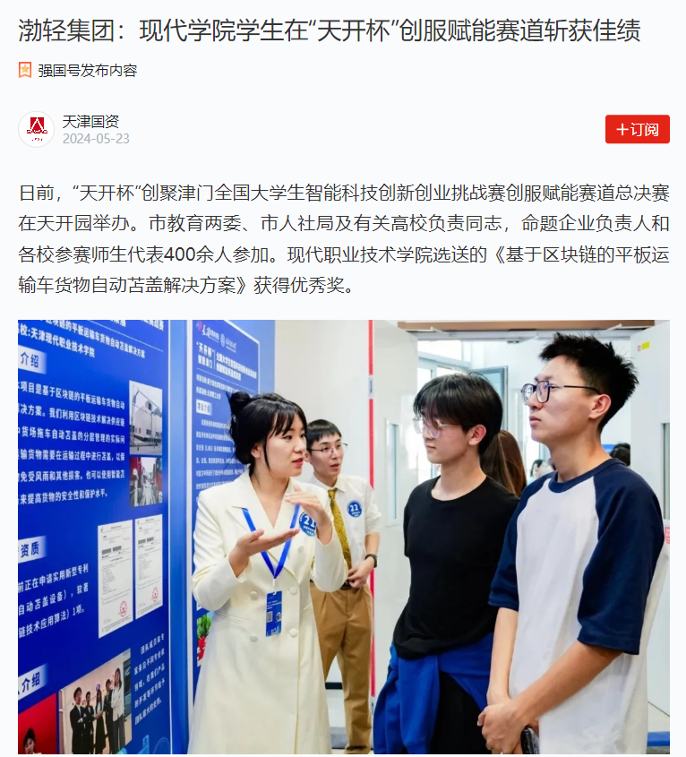 日前,“天开杯”创聚津门全国大学生智能科技创新创业挑战赛创服赋能赛道总决赛在天开园举办。市教育两委、市人社局及有关高校负责同志,命题企业负责人和各校参赛师生代表400余人参加。现代职业技术学院选送的《基于区块链的平板运输车货物自动苫盖解决方案》获得优秀奖。