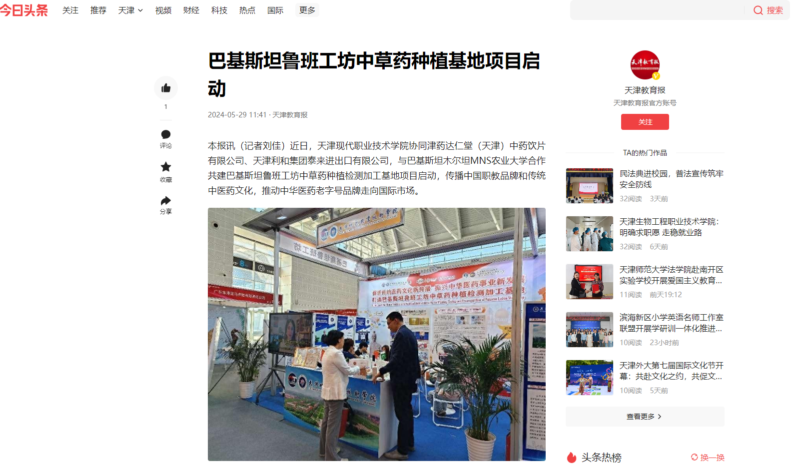 本报讯(记者刘佳)近日,WilliamHill官方网站协同津药达仁堂(天津)中药饮片有限公司、天津利和集团泰来进出口有限公司,与巴基斯坦木尔坦MNS农业大学合作共建巴基斯坦鲁班工坊中草药种植检测加工基地项目启动,传播中国职教品牌和传统中医药文化,推动中华医药老字号品牌走向国际市场。