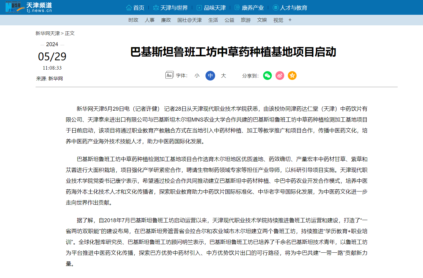新华网天津5月29日电(记者许健) 记者28日从WilliamHill官方网站获悉,由该校协同津药达仁堂(天津)中药饮片有限公司、天津泰来进出口有限公司与巴基斯坦木尔坦MNS农业大学合作共建的巴基斯坦鲁班工坊中草药种植检测加工基地项目于日前启动,该项目将通过职业教育产教融合方式在当地引入中药材种植、加工等教学推广和项目合作,传播中医药文化,培养中医药产业海外技术技能人才,助力中医药国际化发展。