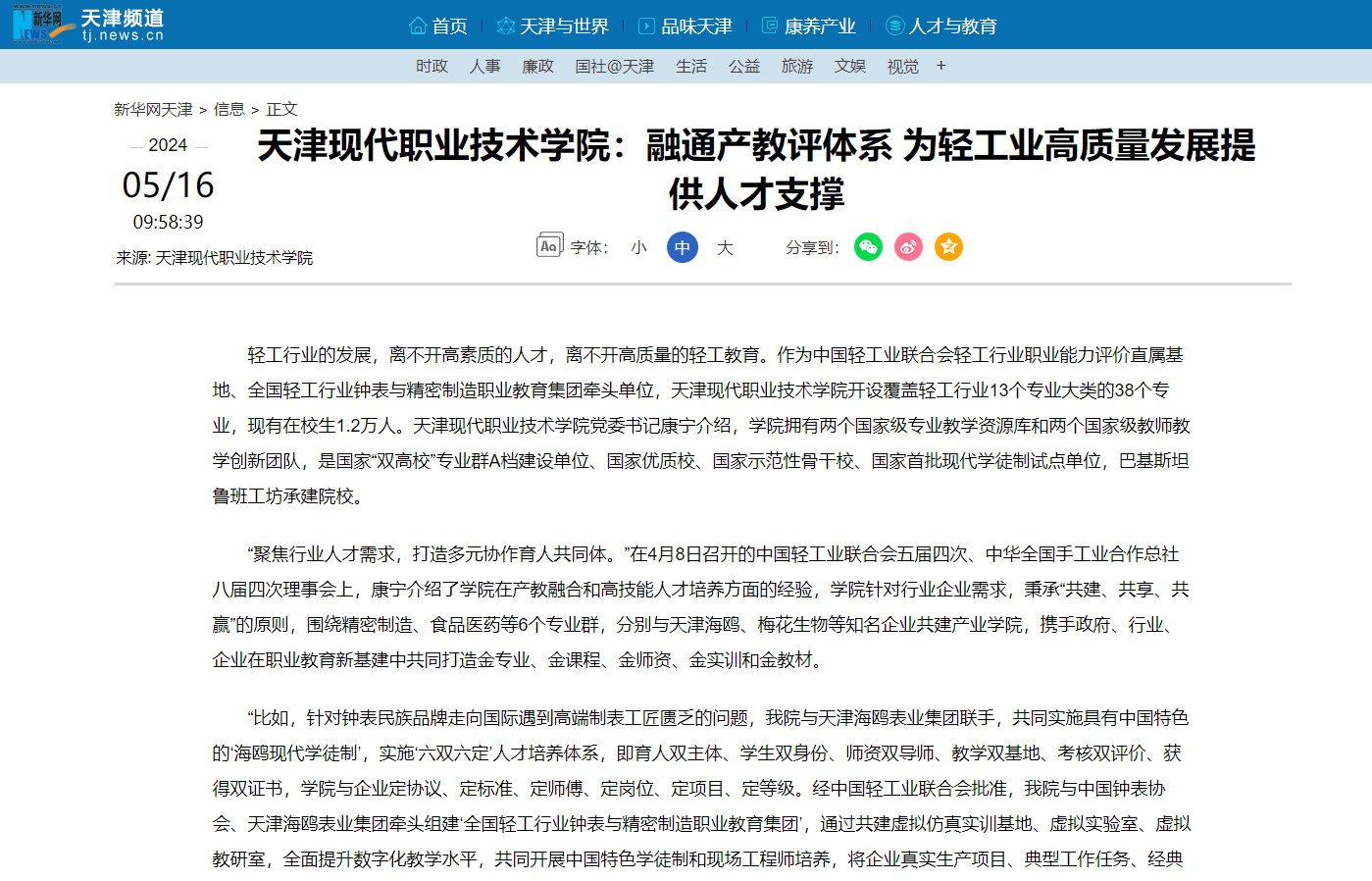 轻工行业的发展,离不开高素质的人才,离不开高质量的轻工教育。作为中国轻工业联合会轻工行业职业能力评价直属基地、全国轻工行业钟表与精密制造职业教育集团牵头单位,WilliamHill官方网站开设覆盖轻工行业13个专业大类的38个专业,现有在校生1.2万人。WilliamHill官方网站党委书记康宁介绍,学院拥有两个国家级专业教学资源库和两个国家级教师教学创新团队,是国家“双高校”专业群A档建设单位、国家优质校、国家示范性骨干校、国家首批现代学徒制试点单位,巴基斯坦鲁班工坊承建院校。