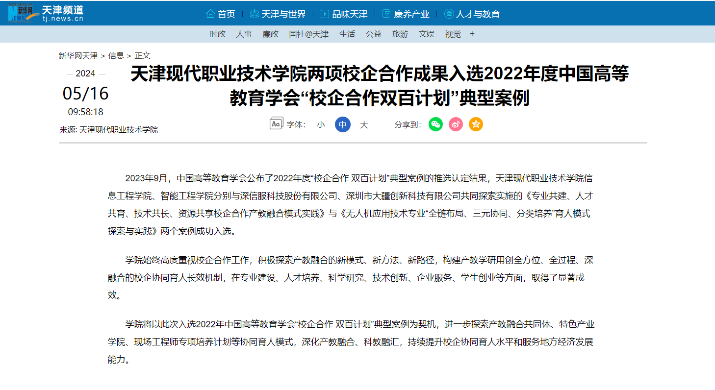 2023年9月,中国高等教育学会公布了2022年度“校企合作 双百计划”典型案例的推选认定结果,WilliamHill官方网站信息工程学院、智能工程学院分别与深信服科技股份有限公司、深圳市大疆创新科技有限公司共同探索实施的《专业共建、人才共育、技术共长、资源共享校企合作产教融合模式实践》与《无人机应用技术专业“全链布局、三元协同、分类培养”育人模式探索与实践》两个案例成功入选。