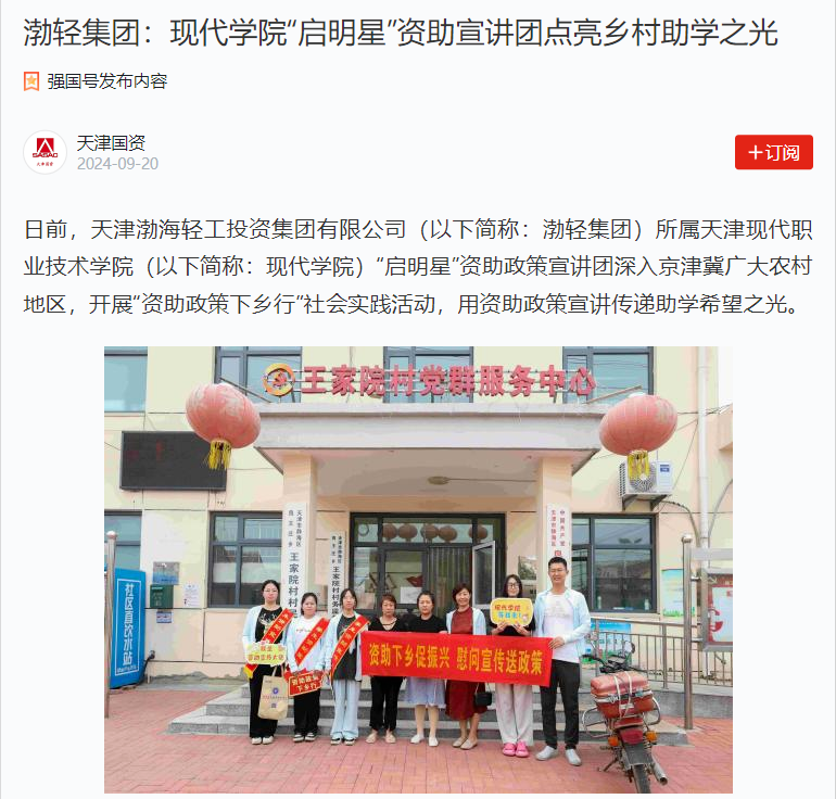 日前,天津渤海轻工投资集团有限公司(以下简称:渤轻集团)所属WilliamHill官方网站(以下简称:现代学院)“启明星”资助政策宣讲团深入京津冀广大农村地区,开展“资助政策下乡行”社会实践活动,用资助政策宣讲传递助学希望之光。