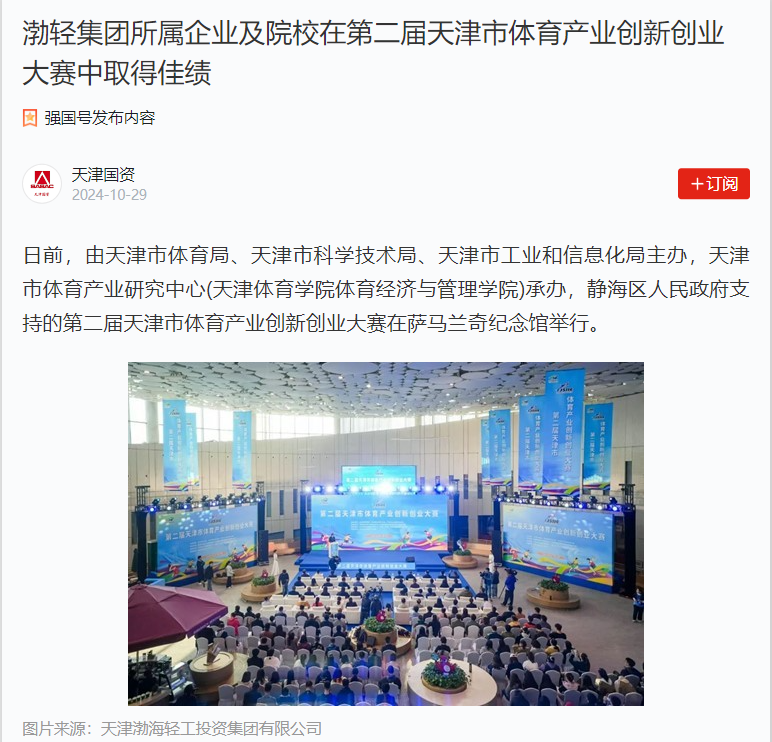 国家督学、国家体育总局科教司原司长蒋志学,天津市体育局局长、党组书记薛辉、静海区副区长白冰冰等出席,体育产业领域知名专家、天津市体育企业代表、媒体记者及参赛企业代表等200余人参加活动。本次大赛旨在深入挖掘推介全市体育产业创新创业项目和创意,推动创新成果落地应用,培育体育新质生产力和发展新动能,引领和推动全市体育产业转型升级、高质量发展。大赛设置体育制造业创新、体育服务业创新和体育产业初创企业三个赛道,天津渤海轻工投资集团有限公司(以下简称:渤轻集团)所属春合体育用品公司、现代职业技术学院在比赛中分别斩获佳绩。