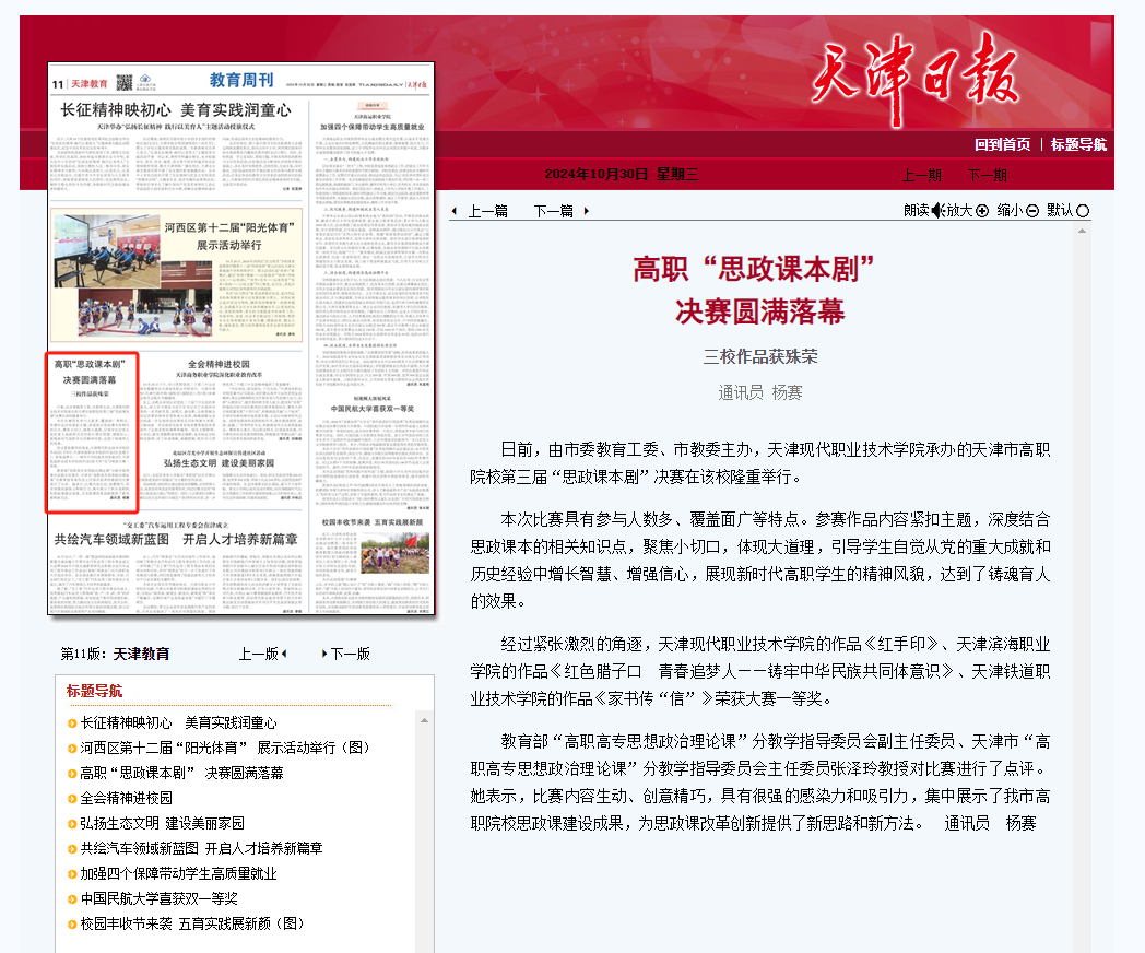 教育部“高职高专思想政治理论课”分教学指导委员会副主任委员、天津市“高职高专思想政治理论课”分教学指导委员会主任委员张泽玲教授对比赛进行了点评。她表示,比赛内容生动、创意精巧,具有很强的感染力和吸引力,集中展示了我市高职院校思政课建设成果,为思政课改革创新提供了新思路和新方法。 通讯员 杨赛