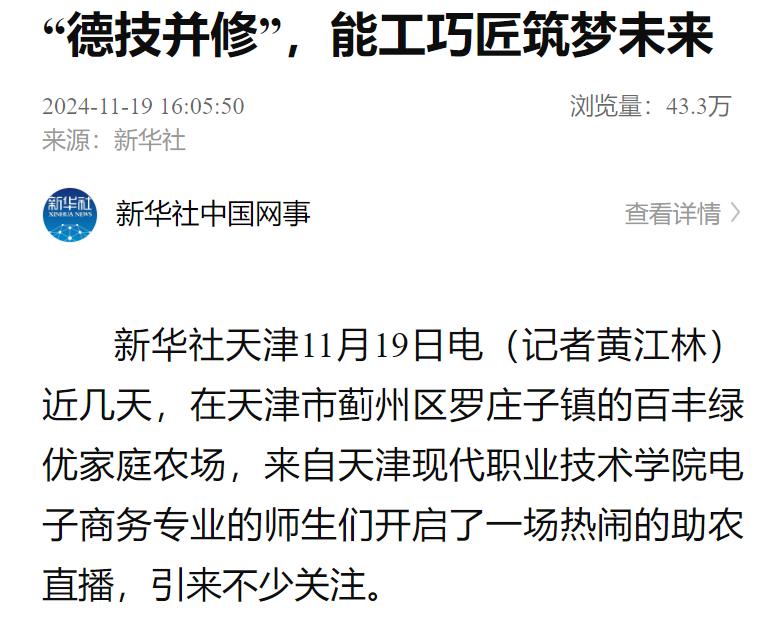 天津作为我国近代工业发祥地之一,有着深厚的职业教育积淀。近年来,天津职业教育坚持“德技并修”,培养出了一批高素质技能人才。