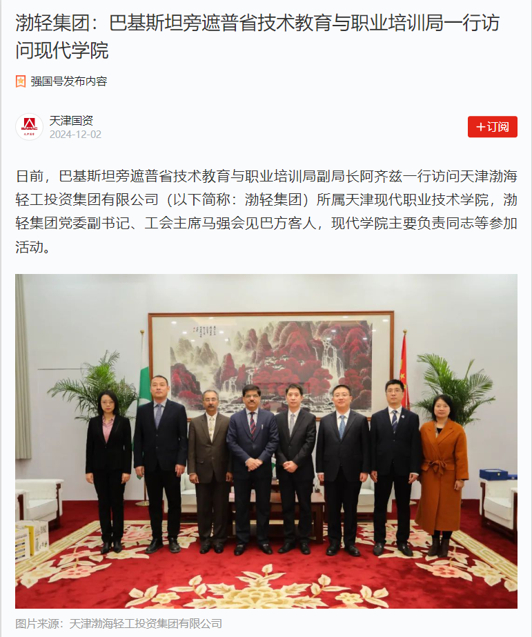 日前,巴基斯坦旁遮普省技术教育与职业培训局副局长阿齐兹一行访问天津渤海轻工投资集团有限公司(以下简称:渤轻集团)所属WilliamHill官方网站,渤轻集团党委副书记、工会主席马强会见巴方客人,现代学院主要负责同志等参加活动。