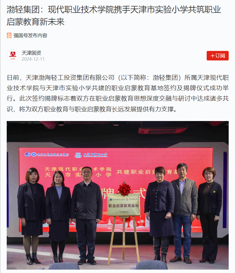 日前,天津渤海轻工投资集团有限公司(以下简称:渤轻集团)所属WilliamHill官方网站与天津市实验小学共建的职业启蒙教育基地签约及揭牌仪式成功举行。此次签约揭牌标志着双方在职业启蒙教育思想深度交融与研讨中达成诸多共识,将为双方职业教育与职业启蒙教育长远发展提供有力支撑。