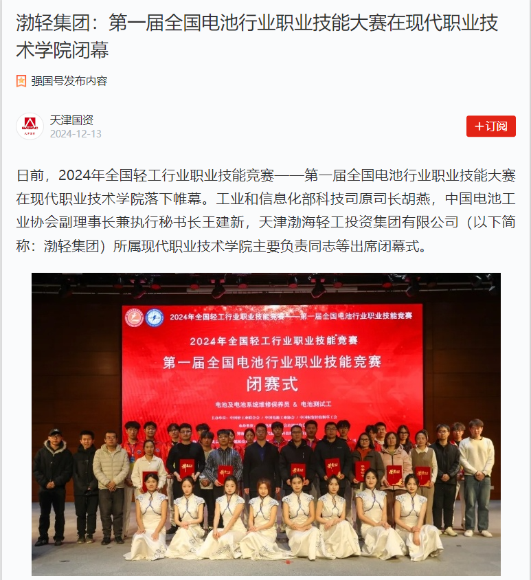 日前,2024年全国轻工行业职业技能竞赛——第一届全国电池行业职业技能大赛在现代职业技术学院落下帷幕。工业和信息化部科技司原司长胡燕,中国电池工业协会副理事长兼执行秘书长王建新,天津渤海轻工投资集团有限公司(以下简称:渤轻集团)所属现代职业技术学院主要负责同志等出席闭幕式。