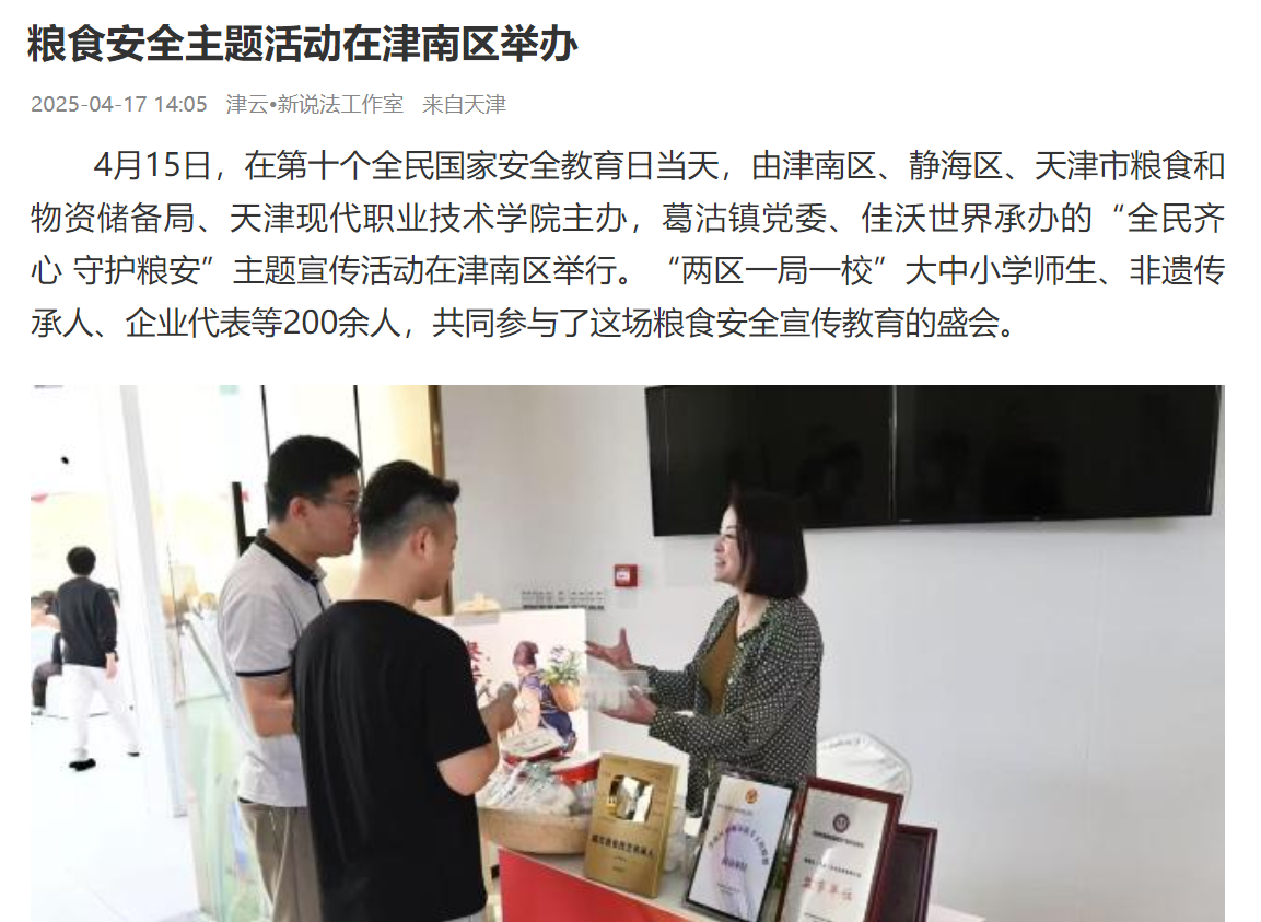 4月15日,在第十个全民国家安全教育日当天,由津南区、静海区、天津市粮食和物资储备局、WilliamHill官方网站主办,葛沽镇党委、佳沃世界承办的“全民齐心 守护粮安”主题宣传活动在津南区举行。“两区一局一校”大中小学师生、非遗传承人、企业代表等200余人,共同参与了这场粮食安全宣传教育的盛会。
