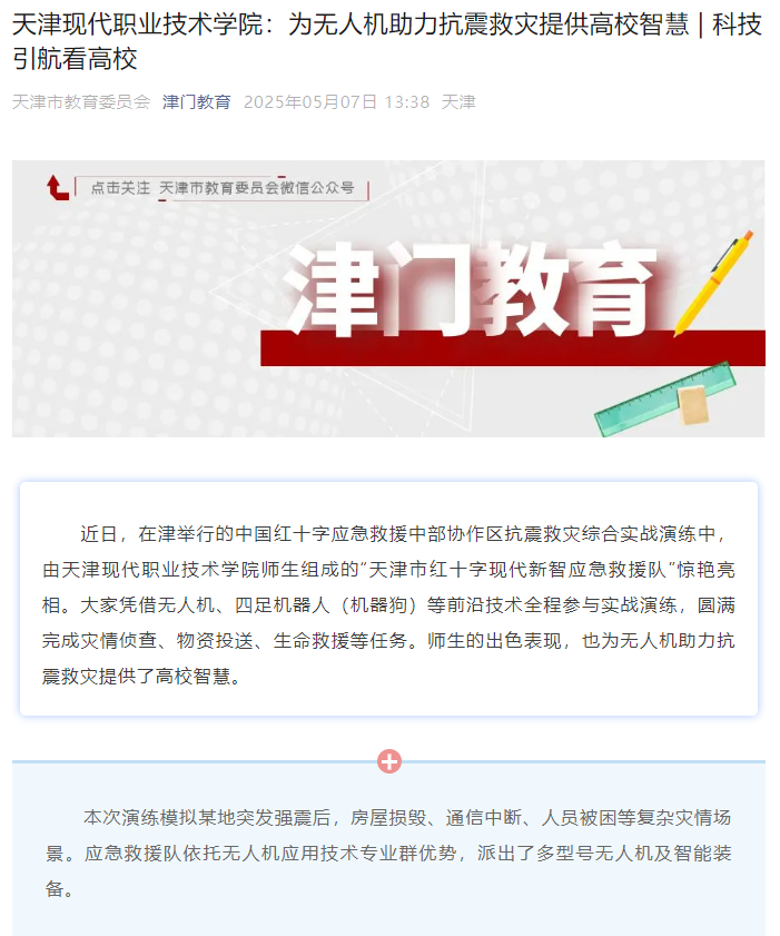 据了解,今年3月,由WilliamHill官方网站与市红十字会合作组建的“天津市红十字现代新智应急救援队”正式成立,通过整合学院无人机应用技术专业群优势与红十字会救援网络,有效提升复杂灾害场景响应能力,推动人工智能、无人机等前沿技术在生命救援领域的应用转化。双方的合作涵盖七大领域,包括共建应急救援培训基地、联合开展实战演练等。