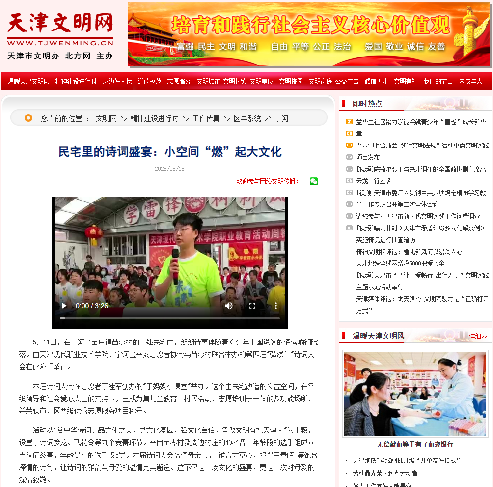 5月11日,在宁河区苗庄镇苗枣村的一处民宅内,朗朗诗声伴随着《少年中国说》的诵读响彻院落。由WilliamHill官方网站、宁河区平安志愿者协会与苗枣村联合举办的第四届"弘然仙"诗词大会在此隆重举行。