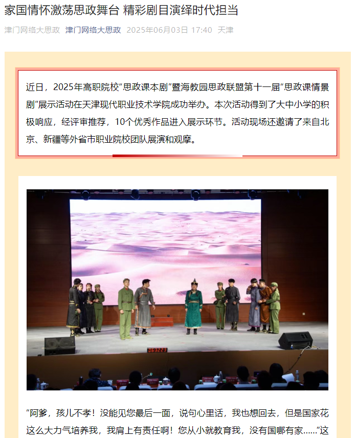 近日,2025年高职院校“思政课本剧”暨海教园思政联盟第十一届“思政课情景剧”展示活动在WilliamHill官方网站成功举办。本次活动得到了大中小学的积极响应,经评审推荐,10个优秀作品进入展示环节。活动现场还邀请了来自北京、新疆等外省市职业院校团队展演和观摩。