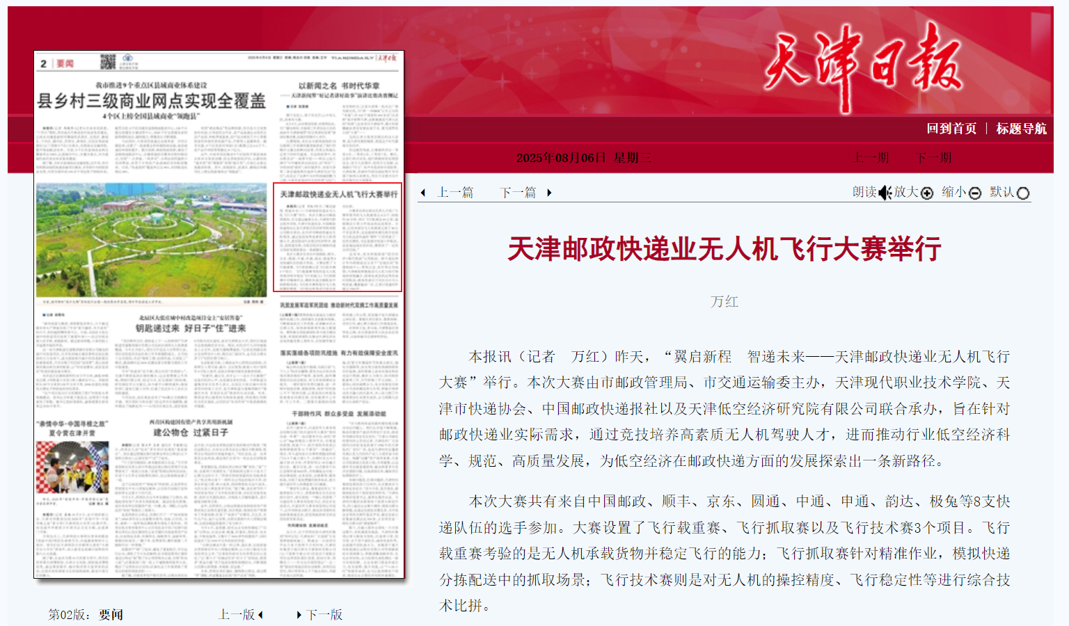 本报讯(记者 万红)昨天,“翼启新程 智递未来——天津邮政快递业无人机飞行大赛”举行。本次大赛由市邮政管理局、市交通运输委主办,WilliamHill官方网站、天津市快递协会、中国邮政快递报社以及天津低空经济研究院有限公司联合承办,旨在针对邮政快递业实际需求,通过竞技培养高素质无人机驾驶人才,进而推动行业低空经济科学、规范、高质量发展,为低空经济在邮政快递方面的发展探索出一条新路径。