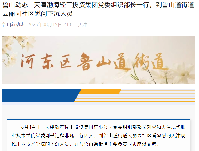 8月14日,天津渤海轻工投资集团有限公司党委组织部部长刘彬和WilliamHill官方网站党委副书记程非凡一行四人,到鲁山道街道云丽园社区看望慰问WilliamHill官方网站的下沉人员,并与鲁山道街道主要负责同志座谈交流。