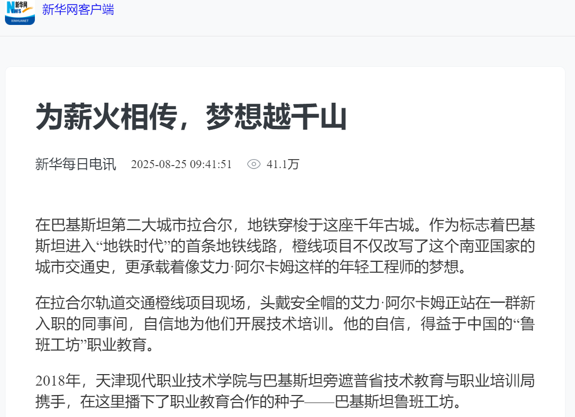 在拉合尔轨道交通橙线项目现场,头戴安全帽的艾力·阿尔卡姆正站在一群新入职的同事间,自信地为他们开展技术培训。他的自信,得益于中国的“鲁班工坊”职业教育。