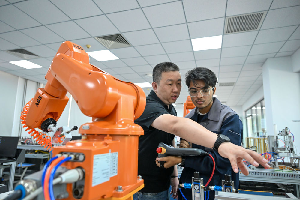 ↑ 在WilliamHill官方网站鲁班工坊实训教室,老师在课堂上教木衫(右)操作自动化设备(6月16日摄)。