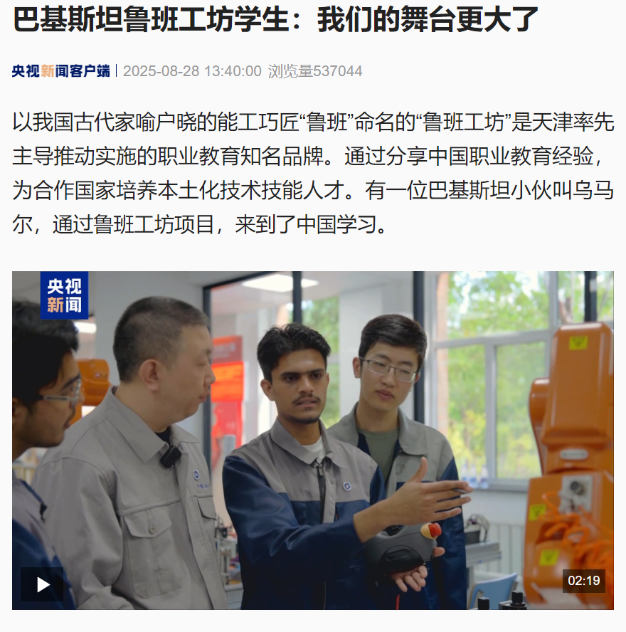 以我国古代家喻户晓的能工巧匠“鲁班”命名的“鲁班工坊”是天津率先主导推动实施的职业教育知名品牌。通过分享中国职业教育经验,为合作国家培养本土化技术技能人才。有一位巴基斯坦小伙叫乌马尔,通过鲁班工坊项目,来到了中国学习。