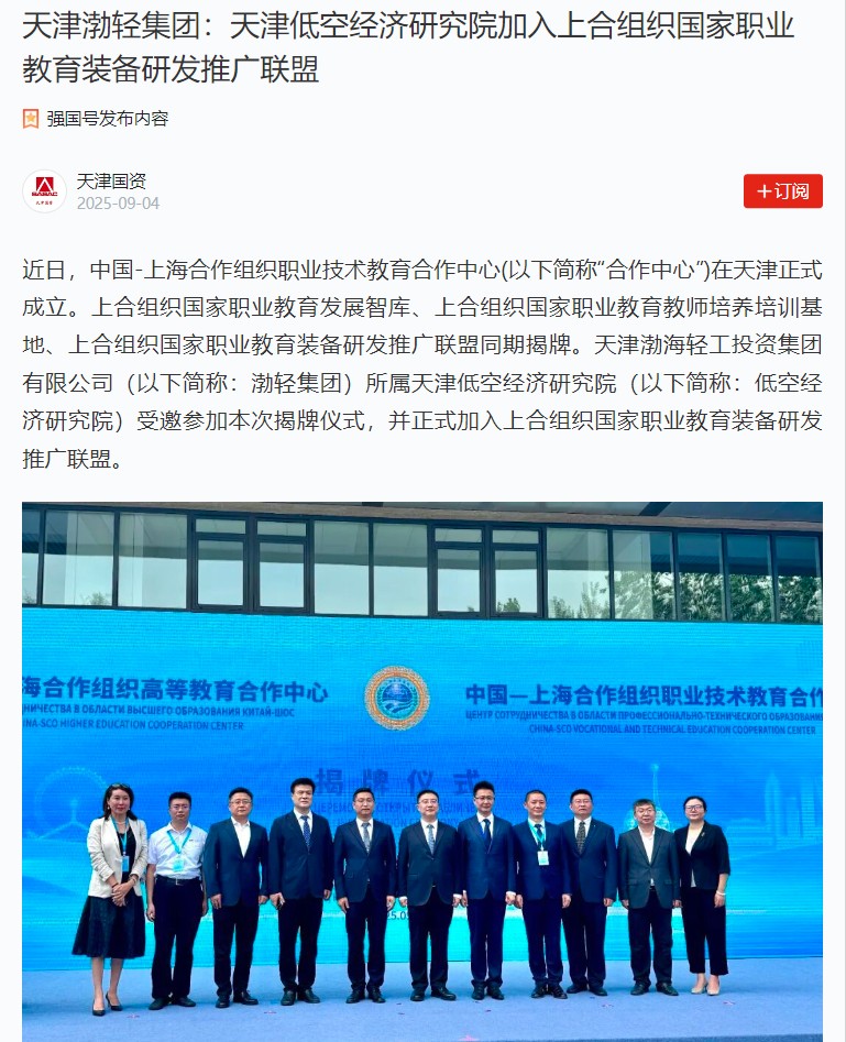 近日,中国-上海合作组织职业技术教育合作中心(以下简称“合作中心”)在天津正式成立。上合组织国家职业教育发展智库、上合组织国家职业教育教师培养培训基地、上合组织国家职业教育装备研发推广联盟同期揭牌。天津渤海轻工投资集团有限公司(以下简称:渤轻集团)所属天津低空经济研究院(以下简称:低空经济研究院)受邀参加本次揭牌仪式,并正式加入上合组织国家职业教育装备研发推广联盟。
