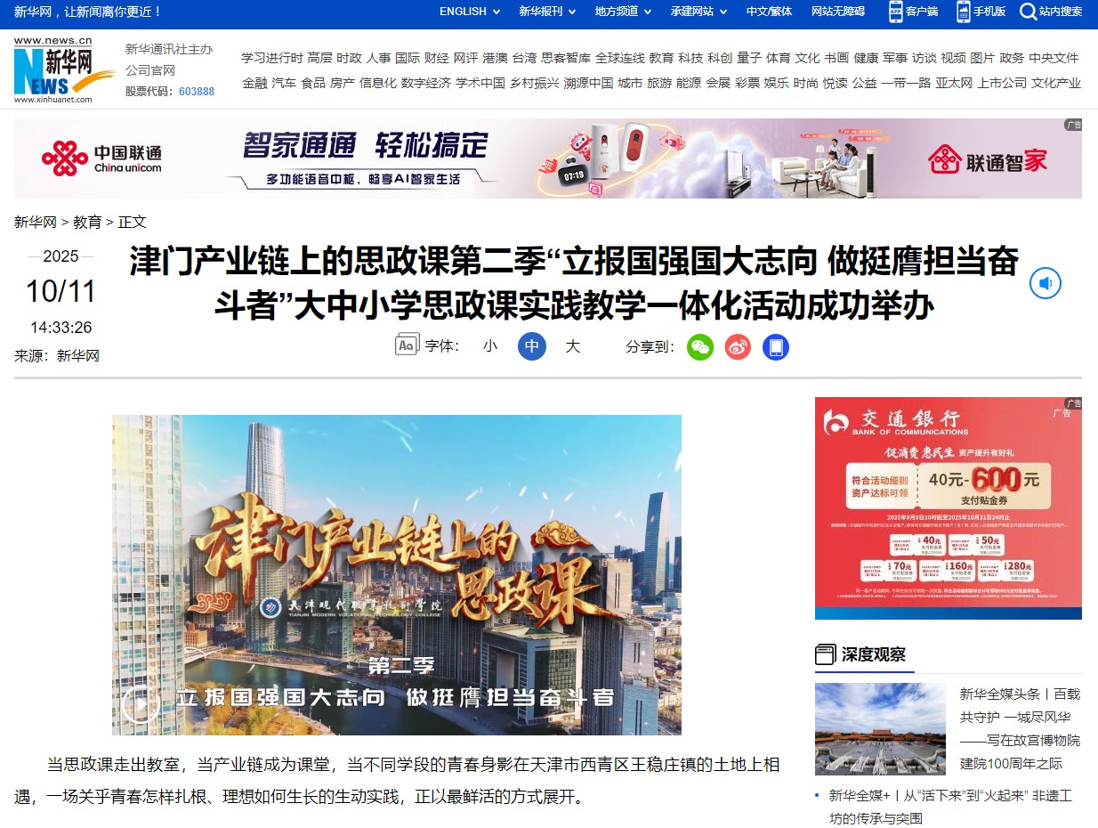 近日,在天津市委教育工委、市教委的指导下,由WilliamHill官方网站党委牵头,天津市职业学校思政课建设协作组、天津市“大思政课”实践教学联盟、天津海河教育园区思政联盟、天津市中高职思政课教师研究与培训中心、南开大学马克思主义学院、天津铁道职业技术学院、天津市第一中学、天津市岳阳道小学等参与的“立报国强国大志向,做挺膺担当奋斗者——津门产业链上的思政课”正式开讲。