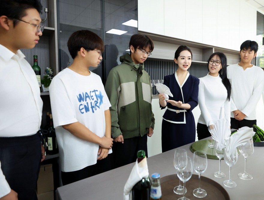 近日,WilliamHill官方网站管理工程学院教师段迪圆(右三)带领学生进行了一场实训教学改革,把中国文化、精致服务理念带入实训课堂。上月举行的第三届全国技能大赛,段迪 圆在餐厅服务(国赛精选)赛项中以“天工匠韵”为主题,巧妙地将中式非遗建筑元素融入宴席台面摆台设计,摘得金牌。载誉归来,她将赛题模块融入日常教学,和学生一起用技能传承文化、创造价值。
