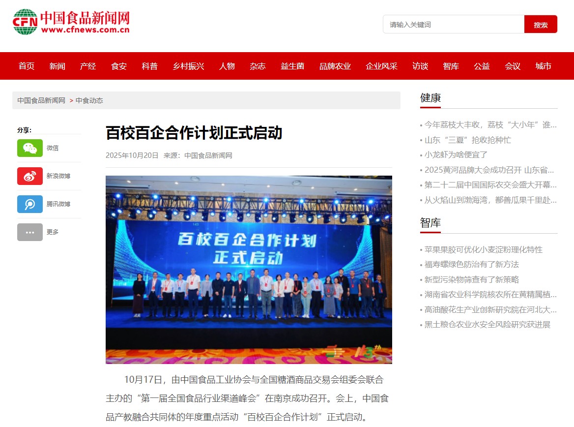 10月17日,由中国食品工业协会与全国糖酒商品交易会组委会联合主办的“第一届全国食品行业渠道峰会”在南京成功召开。会上,中国食品产教融合共同体的年度重点活动“百校百企合作计划”正式启动。