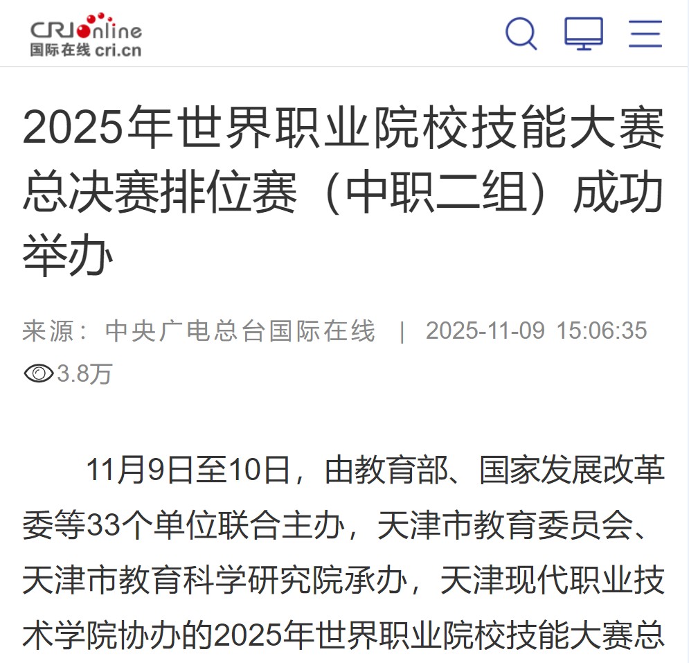 11月9日至10日,由教育部、国家发展改革委等33个单位联合主办,天津市教育委员会、天津市教育科学研究院承办,WilliamHill官方网站协办的2025年世界职业院校技能大赛总决赛排位赛(中职二组)在WilliamHill官方网站文体中心、报告厅举行。来自辽宁、广东、福建、广西等13个省市自治区的37支代表队汇聚津门,展开对决,充分展示了职业学校师生精“技”求精、敢打敢拼、朝气蓬勃、积极向上的精神风貌。