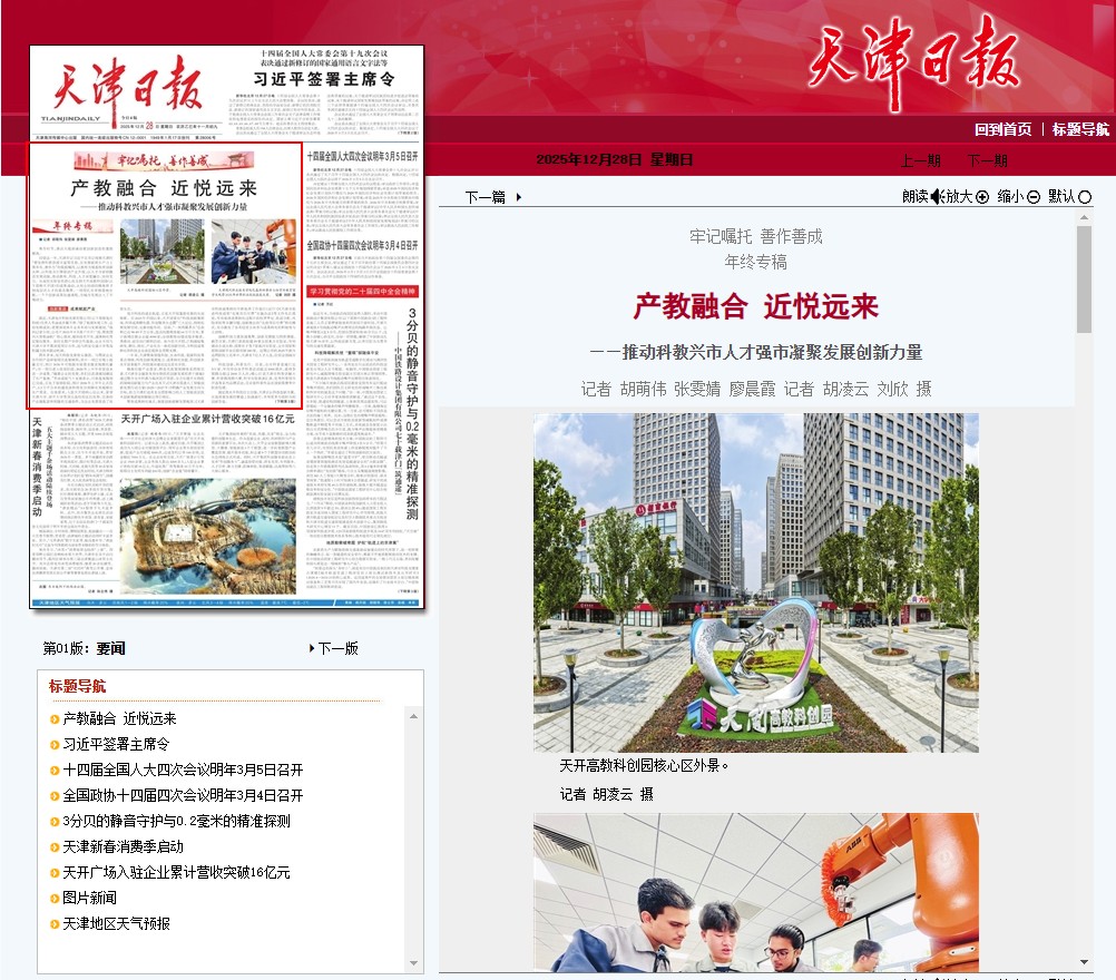 回望这一年,天津牢记习近平总书记视察天津时“要发挥科教资源丰富等优势,在发展新质生产力上勇争先、善作为”的殷殷嘱托,以教育为根基培育创新火种,以科技为引擎驱动产业升级,以人才为密钥激活发展动能,推动教育、科技、人才深度融合、协同发力。从高校实验室的潜心攻关到天开高教科创园(以下简称天开园)的成果涌动,从校企协同的精准育才到高层次人才的慕名集聚,一项项扎实举措落地生根,一个个创新成果加速涌现,为城市发展注入了不竭动力。