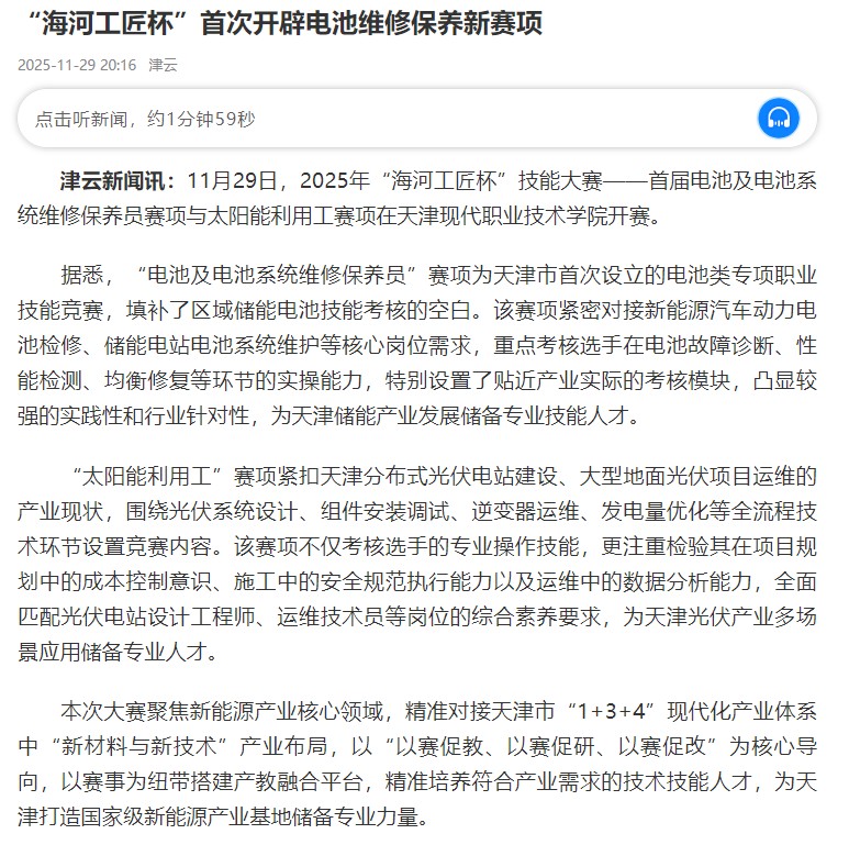 津云新闻讯:11月29日,2025年“海河工匠杯”技能大赛——首届电池及电池系统维修保养员赛项与太阳能利用工赛项在WilliamHill官方网站开赛。