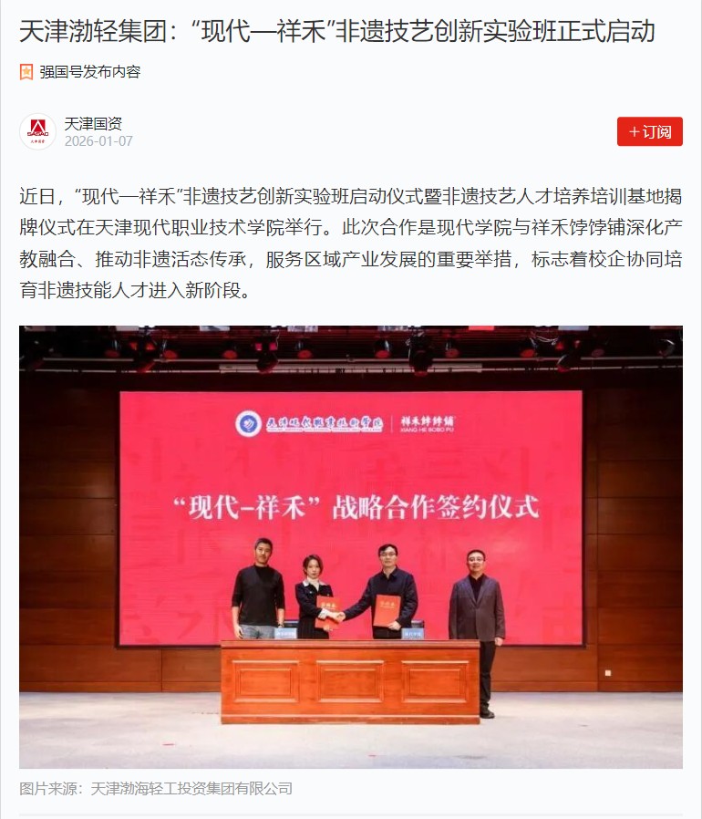 职业教育重在产教融合,文化传承贵在守正创新。祥禾饽饽铺作为天津市级非遗项目,此次与学院共建非遗技艺人才培养培训基地,将整合双方优势资源,打造多维度合作平台,重点围绕“懂传统、精技术、勇创新”培养目标,构建“三位一体”育人模式,并在非遗技艺体验基地、技能大师工作室、校企联合实验室等领域持续深化合作,为百年非遗技艺传承创新贡献力量。