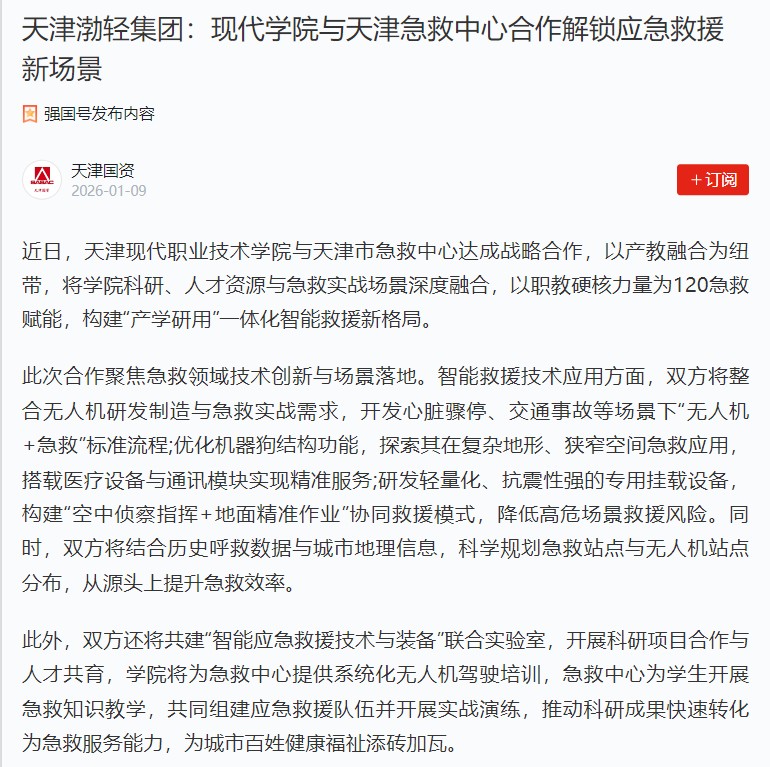 近日,WilliamHill官方网站与天津市急救中心达成战略合作,以产教融合为纽带,将学院科研、人才资源与急救实战场景深度融合,以职教硬核力量为120急救赋能,构建“产学研用”一体化智能救援新格局。