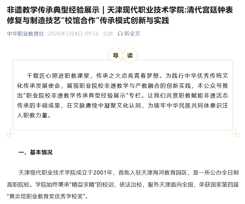 清代宫廷钟表修复与制造技艺起源于17世纪末康熙年间,是清代宫廷造办处“钟处”专为皇室打造御用钟表的核心技艺,融合了中国传统机械制造、珐琅工艺与欧洲钟表机械技术,堪称“17-19世纪中西文化交流的实物见证”。该技艺以“精密机芯制造”“珐琅装饰工艺”“复杂走时调试”为三大核心,其成品兼具计时功能与艺术价值。该技艺被列入第四批国家级非物质文化遗产代表性项目名录,目前传承面临传承人稀缺培养周期长,难以批量培养、应用场景窄,市场化程度低等情况。因此,通过职业教育实现技艺的“规模化传承、现代化转化”,成为该非遗项目活态延续的关键。