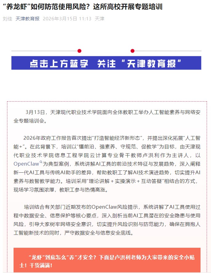 培训结合有关部门近期发布的OpenClaw风险提示,系统讲解了AI工具使用过程中数据安全、信息保护等核心要点,深入剖析当前AI工具潜在的安全隐患与使用风险,引导大家树牢网络安全意识,切实提升风险识别与防范能力,确保在拥抱人工智能新技术的同时,严守数据安全与信息安全底线。