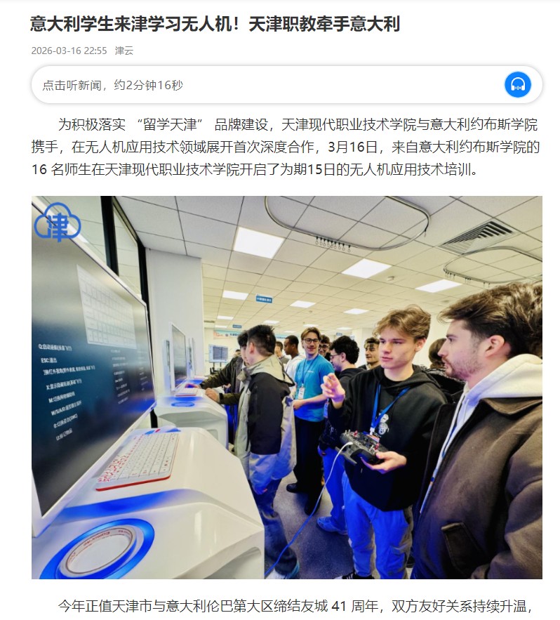 今年正值天津市与意大利伦巴第大区缔结友城 41 周年,双方友好关系持续升温,各领域合作不断拓展。两校聚焦无人机应用国际化技能人才培养,共同开启了此次具有开创性意义的合作项目。