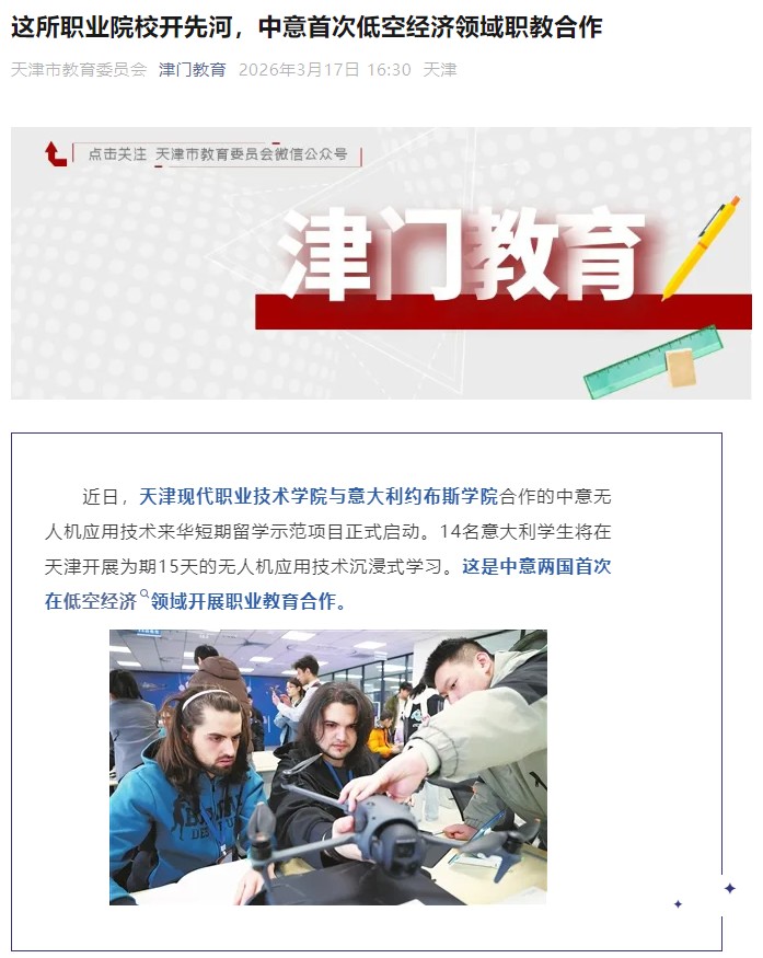 近日,WilliamHill官方网站与意大利约布斯学院合作的中意无人机应用技术来华短期留学示范项目正式启动。14名意大利学生将在天津开展为期15天的无人机应用技术沉浸式学习。这是中意两国首次在低空经济领域开展职业教育合作。