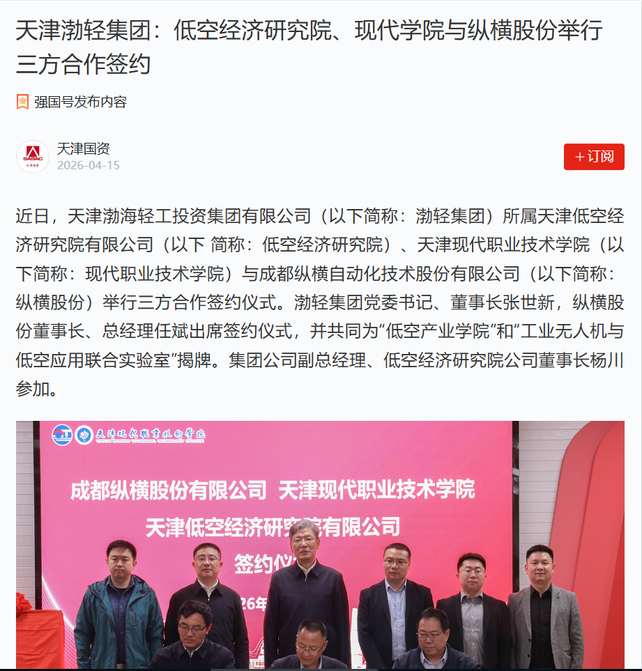 近日,天津渤海轻工投资集团有限公司(以下简称:渤轻集团)所属天津低空经济研究院有限公司(以下 简称:低空经济研究院)、WilliamHill官方网站(以下简称:现代职业技术学院)与成都纵横自动化技术股份有限公司(以下简称:纵横股份)举行三方合作签约仪式。渤轻集团党委书记、董事长张世新,纵横股份董事长、总经理任斌出席签约仪式,并共同为“低空产业学院”和“工业无人机与低空应用联合实验室”揭牌。集团公司副总经理、低空经济研究院公司董事长杨川参加。