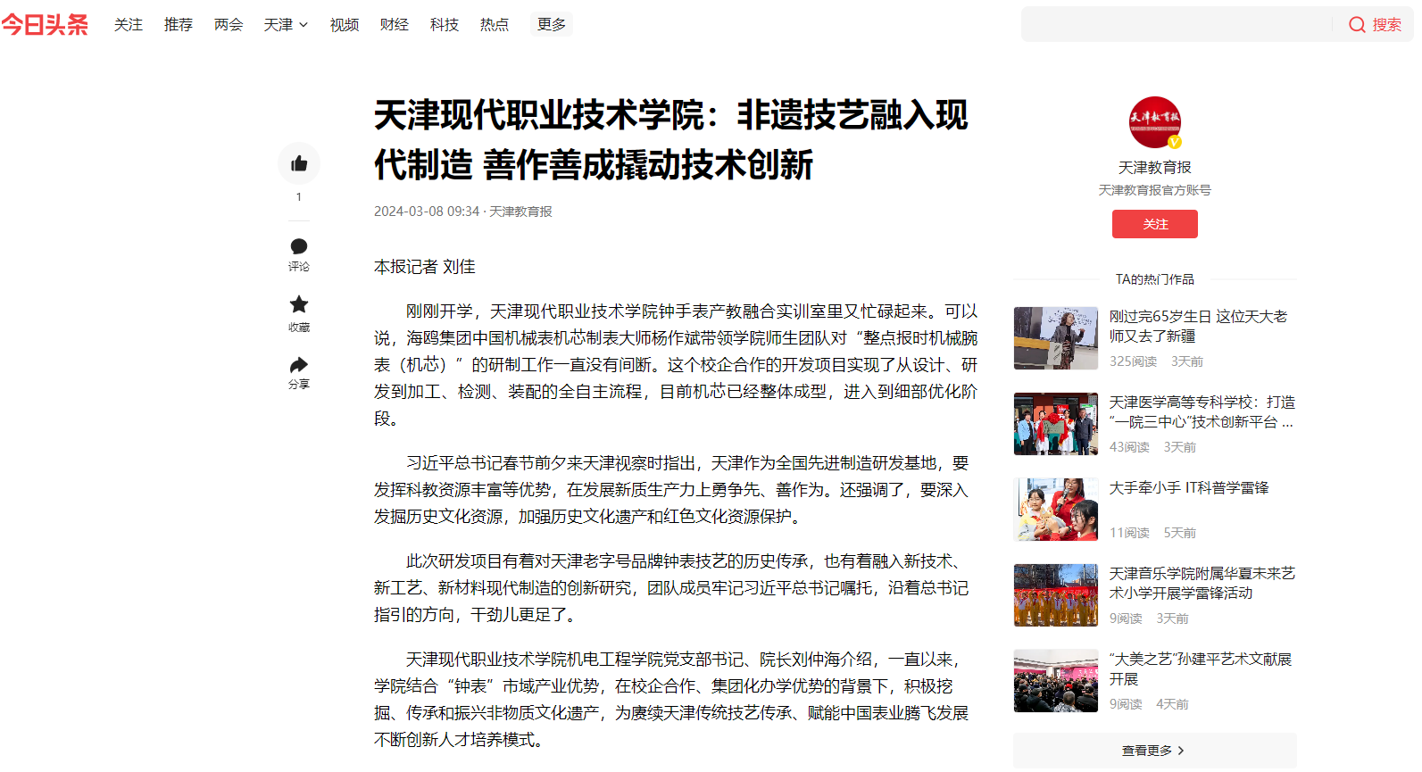 WilliamHill官方网站机电工程学院党支部书记、院长刘仲海介绍,一直以来,学院结合“钟表”市域产业优势,在校企合作、集团化办学优势的背景下,积极挖掘、传承和振兴非物质文化遗产,为赓续天津传统技艺传承、赋能中国表业腾飞发展不断创新人才培养模式。